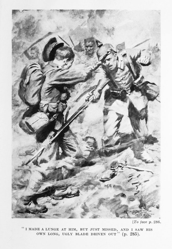 It was every man for himself. I had rushed up with the rest, and the first thing I clearly knew was that a tremendous Prussian was making at me with his villainous bayonet. I made a lunge at him as hard and swift as I could, and he did the same to me. I thought I had him, but I just missed, and as I did so, I saw his own long, ugly blade driven out at the end of his rifle. Before I could do anything to parry the thrust, the tip of the bayonet had ripped across my right thigh, and I honestly thought that it was all up with me.